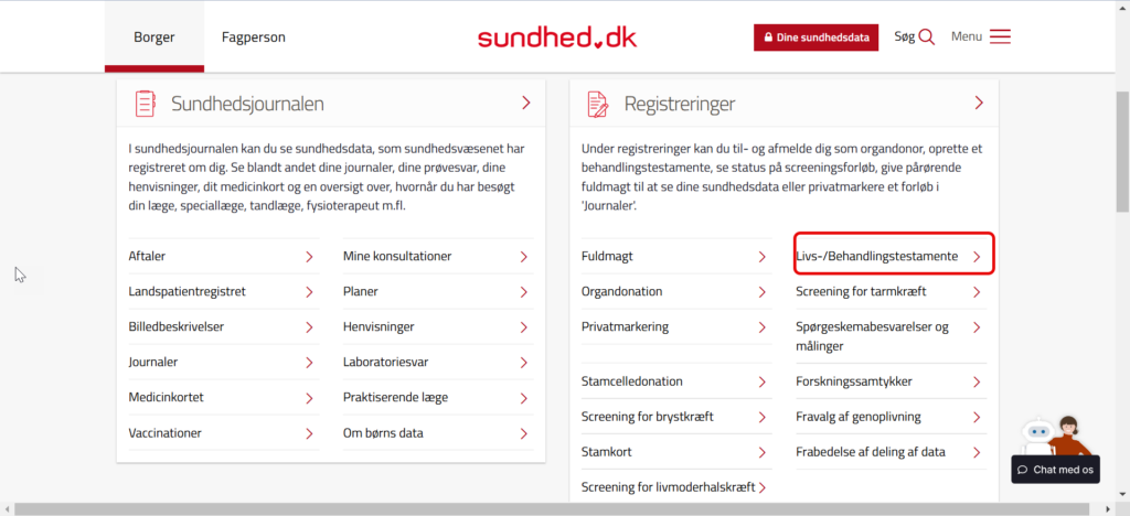 - Under “Registreringer” vælger du “Livs-/Behandlingstestamente”