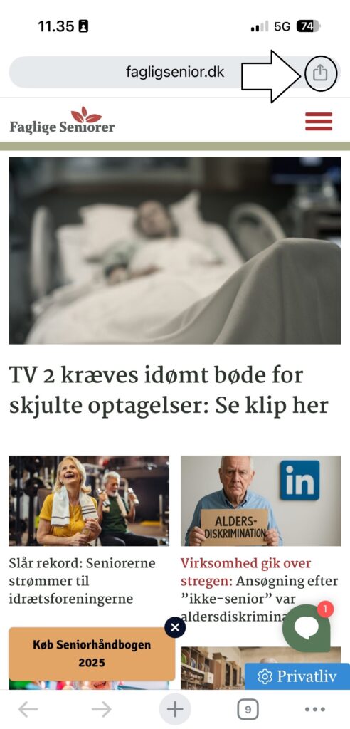 2 Tryk på upload ikonet nederst, som hvis du vil dele siden (se billede).