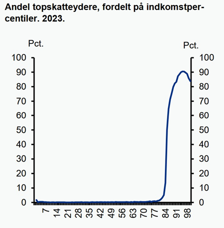 Opgørelsen fortæller også, hvor store andele der betaler topskat. Det bemærkelsesværdige er, at selv blandt borgere med de allerhøjeste indkomster er det ikke alle, der bidrager til samfundet med topskat.